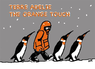 La couleur traditionnelle de l’IPEV ( Institut Paul-Emile Victor anciennement Institut Polaire Français) pour des raisons que je ne connais mal, est l’orange. C’est la couleur de l’ancien drapeau des Expéditions Polaires Française ainsi que de l’actuel drapeau international officieux de l’Antarctique. Les bâtiments de la base et certains vêtements de travail comme la fameuse « VTN » sont aussi de cette couleur. Enfin c’est aussi la petite touche de couleur "chaude" qu’on retrouve sur nos compagnons d’hivernage, les empereurs.